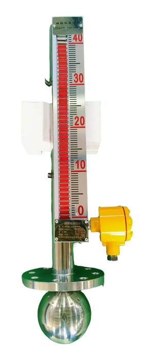 侧装式磁性翻版液位计与压力容器或常压罐体是一个有机组成部件来完成液位监控的。液位计二侧管通过法兰与容器侧面相连接形成连通结构。这样,容器内的液体通过二侧管直接流进液位计腔内,使容器内液体变化与液位计腔内的液位变化一致,液位计腔内的圆柱形浮子根据容器内的液体变化而变化,(浮子内部含有一束永久性磁性系统),其磁场平面与容器内液面重合。浮子的磁场穿透液位计管壁与外部的显示面板、模拟量单元、报警开关单元装置接通,以完成非接触测量和监控。